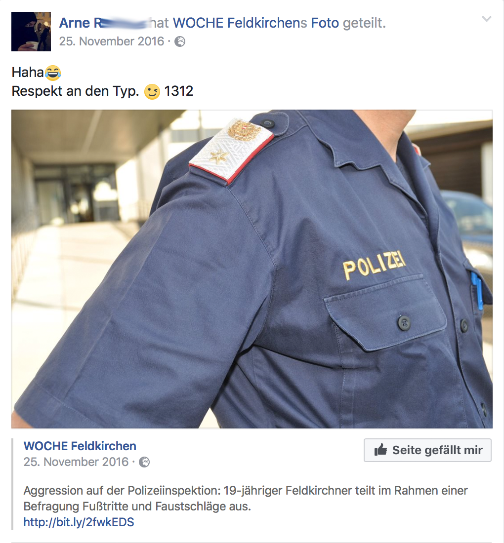 Auf Facebook bekennt er sich nicht nur zu Gewalt gegen „Nazis“, sondern auch der Gewalt gegen Polizisten zollt er Respekt: