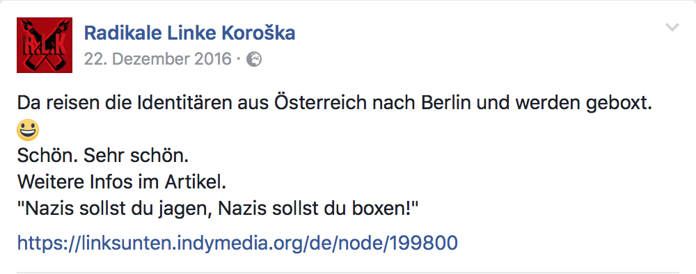 Inzwischen ruft die „Radikale Linke Koroska“ und die „Autonome Antifa Koroska“ zur Teilnahme an der Gerichtsverhandlung auf. Nicht ganz zufällig, denn es sitzen auch deren Unterstützer auf der Anklagebank.